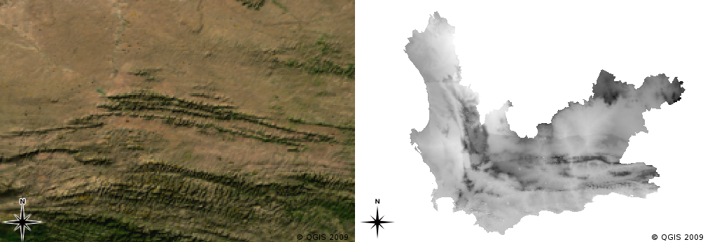 True colour raster images (left) are useful as they provide a lot of detail that is hard to capture as vector features but easy to see when looking at the raster image. Raster data can also be non-photographic data such as the raster layer shown on the right which shows the calculated average minimum temperature in the Western Cape for the month of March.