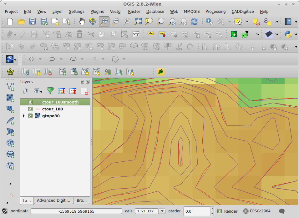 However, the purpose of this example is different. The contour lines created by r.contour have sharp angles that should be smoothed. Among the v.generalize algorithms, there is Chaiken’s, which does just that (also Hermite splines). Be aware that these algorithms can add additional vertices to the vector, causing it to load even more slowly.