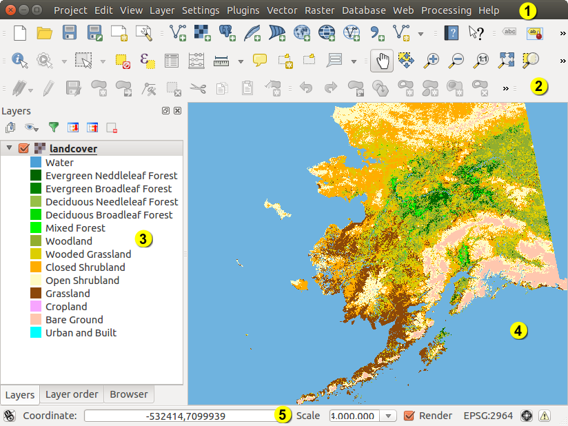 Quand QGIS démarre, l’interface se présente à vous sous la forme affichée ci-dessous (les nombres de 1 à 5 dans les cercles jaunes se réfèrent aux cinq zones principales de l’interface décrites ici).