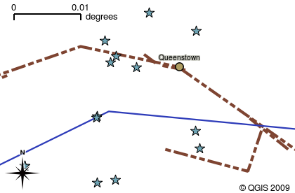 Quando você abre uma camada no SIG ela aparecerá no mapa. A visualização do mapa mostra um gráfico representando sua camada. Quando você adiciona mais de uma camada ao mapa, as camadas são sobrepostas umas sobres as outras. Veja a figura figure_map_view_1, figure_map_view_2, figure_map_view_3 and figure_map_view_4 para ver um mapa que tem muitas camadas sendo adicionadas a ele. Uma importante função do mapa é permitir você aproximar ou afastar para ver o quão grande é a área do entorno no mapa.