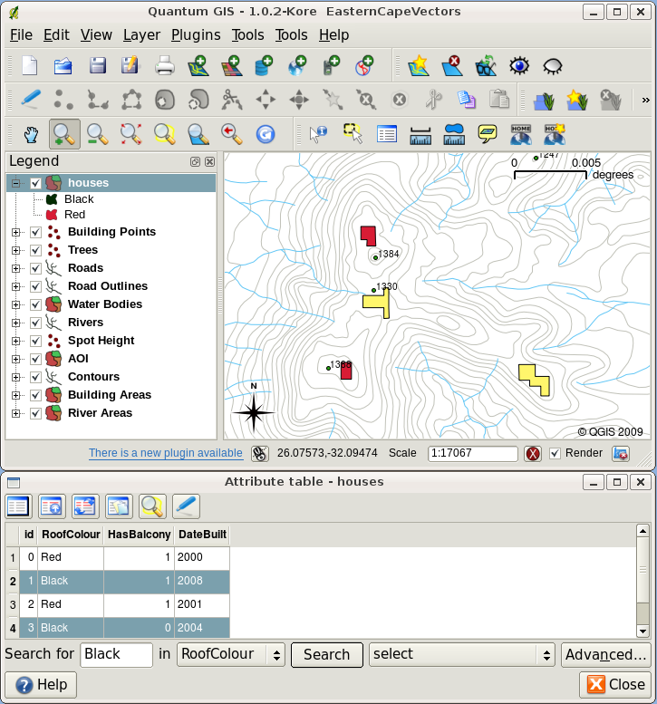 Em um aplicativo SIG, nós podemos também procurar por feições baseadas em seus atributos. Aqui nos vemos a busca por casa com telhados negros. Resultados são mostrados em amarelo no mapa, e turquesa na tabela.