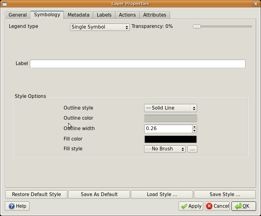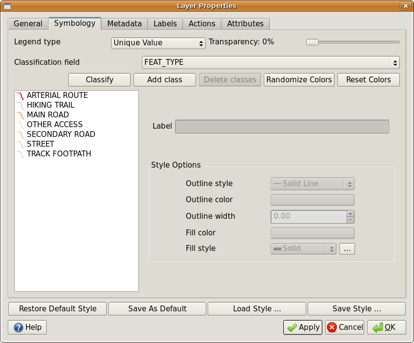 Uma aplicação SIG normalmente permitirá a você configurar a simbologia de uma camada usando uma caixa de diálogo como a da figura figure_single_symbol_1. Nesta caixa de diálogo você pode cores e estilos de símbolos. Dependendo do tipo de geometria da cama, diferentes opções podem sem mostradas. Por exemplo, com camadas de pontos você pode selecionar um estilo de marcador. Com camadas de linhas e polígonos não há a opção estilo do marcador, porém, você poderá selecionar o estilo da linha e cor como linhas alaranjadas e pontilhada para estradas cascalho, linhas alaranjadas e contínuas para rodovias secundárias, (como mostrado em igure_single_symbol_2). Com camadas de polígonos você também tem a opção de configuração do estilo de preenchimento e cores.