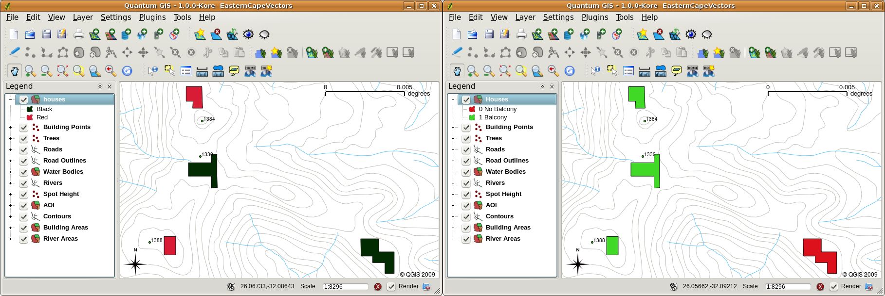 Numa aplicação SIG, nós podemos desenhar feições diferentemente dependendo do seus atributos. À esquerda nós temos o desenho dos polígonos com a mesma cor do atributo telhado. À direita nós codificamos as cores de acordo com o se existe ou não varanda.