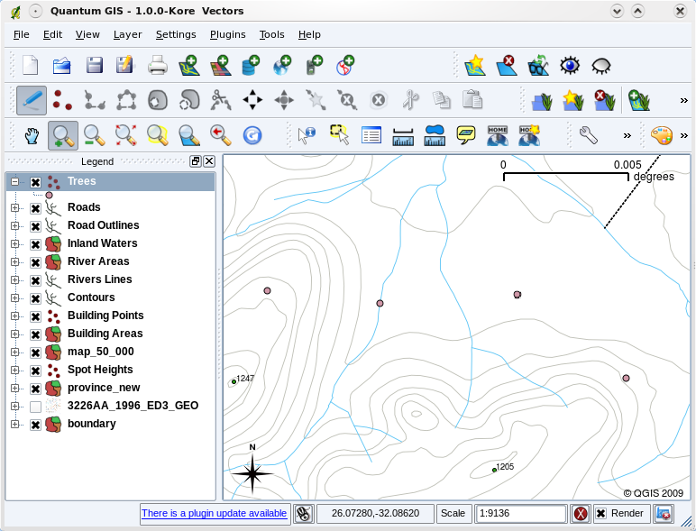 Quando uma camada (por exemplo a camada de árvores acima) é carregada pela primeira vez, o aplicativo de SIG irá mostrar esta com uma simbologia genérica.