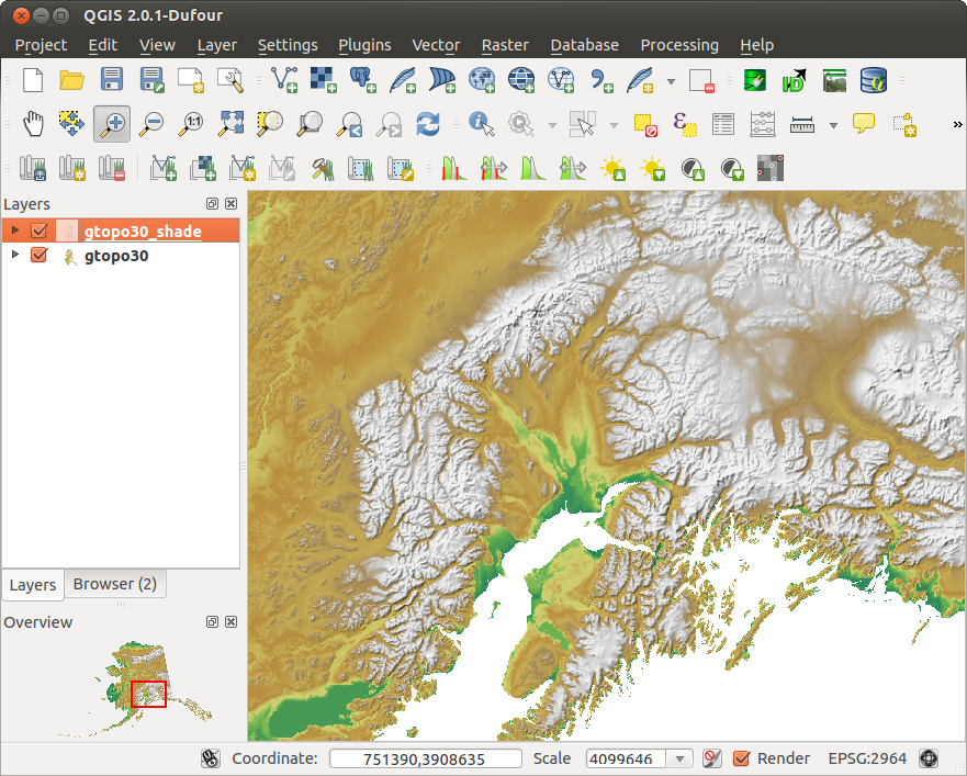 Após terminar o processo, mude para o: guilabel: ‘Navegador’ e clique duas vezes sobre o novo “raster gtopo30_shade2” para exibi-lo no | QG |.